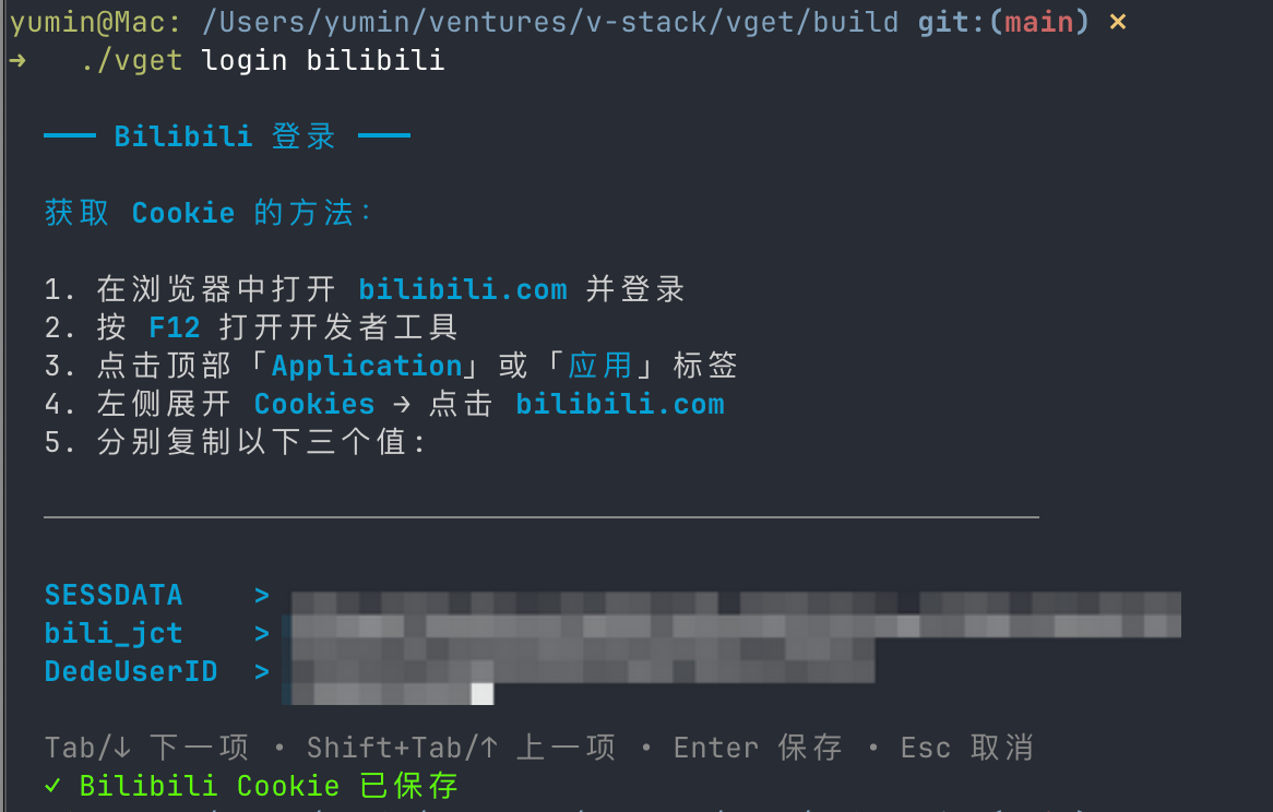 运行后会显示交互式界面,按照提示获取并粘贴 Cookie:
